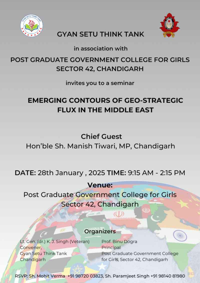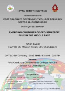 Gyan Setu Think Tank in collaboration with Post Graduate Government Girls College, Sector 42, Chandigarh organized a one day seminar on the subject – Emerging Contours of Geo-Strategic Flux in the Middle-East on January 28, 2025. The Seminar was organized at Post Graduate Government Girls College, Sector 42, Chandigarh to understand and discuss the ongoing developments in the Middle-East and how these developments may affect India and world at large.