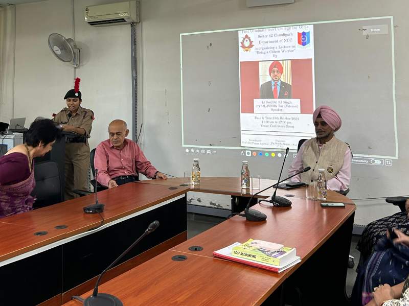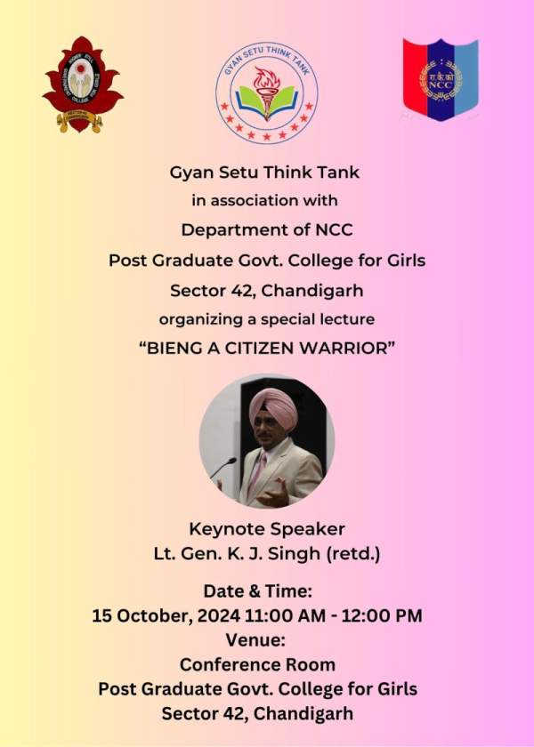 Gyan Setu Think Tank organized a special lecture “Being a Citizen Warrior” on 15th October, 2024 at Post Graduate Govt. College for Girls, Sector 42, Chandigarh. The special lecture was organized for the NCC Cadets of the College. The lecture was delivered by Lt. Gen. K. J. Singh (retd.), Convener of the Gyan Setu Think Tank.
