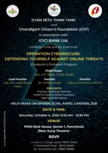 Gyan Setu Think Tank and the Chandigarh Citizen’s Foundation (CCF), in association with ICICI Bank Ltd., successfully concluded the veteran’s outreach program, “Operation Cybersecure: Defending Yourself Against Online Threats,” held on Saturday, October 4, 2025, at the PWD Rest House in Sector 1, Panchkula.